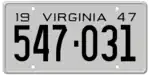 1947 Embossed black serial on unpainted aluminum plate; "19 VIRGINIA 47" at top 123-456 1 to approximately 567-000