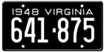 1948 Embossed white serial on black plate; "1948 VIRGINIA" at top 123-456 1 to approximately 642-000