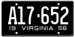 1956 Embossed white serial on black plate; "19 VIRGINIA 56" at bottom 123-456 1 to 999-999