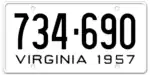 1957 Embossed black serial on white plate; "VIRGINIA 1957" at bottom 123-456 1 to 999-999