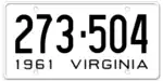 1961 Embossed black serial on white plate; "1961 VIRGINIA" at bottom 123-456 1 to 999-999