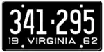 1962 Embossed white serial on black plate; "19 VIRGINIA 62" at bottom 123-456 1 to 999-999