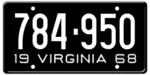 1968 Embossed white serial on black plate; "19 VIRGINIA 68" at bottom 123-456 1 to 999-999