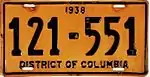 1938 | Embossed black serial on golden yellow plate with border line; "1938" and "DISTRICT OF COLUMBIA" centered at top and bottom respectively | none | 123-456 | 46-001 to approximately 182-000 | |