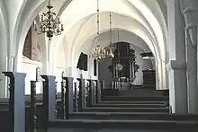 The Renaissance-style altar front, altarpiece and pulpit date from around 1599 and were probably all made by the same workshop. The Romanesque baptismal font with relief decorations is carved in granite. The Gothic era is represented with a Late Gothic crucifix. The pews are designed in the Baroque style. A robust door with iron fittings in one of the porches is from 1556 and features an inscription that states that it offers protection against all devil's claws. Three paintings date from the same period. The two church bells are from 1489 and 1576.[1]