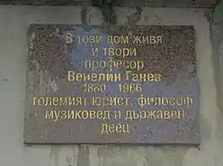The memorial plaque at 53 "6-th September" Str., Sofia, where Ganev lived.