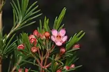 The flowers are few in number, arranged in some of the upper leaf axils on stalks 9–19 mm (0.4–0.7 in) long. The sepals are deep pink and 4 mm (0.2 in) long including their lobes and fine white fringe. The petals are roughly circular in shape, deep pink, 4 mm (0.2 in) long with four to six main long pointed lobes and many smaller lobes. The style is about 0.3 mm (0.01 in) long with short hairs around its end. Flowering time is mostly in November to January.[1][2][3]