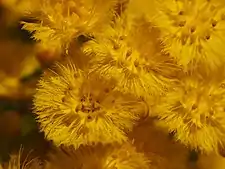 The flowers are honey-scented and arranged in corymb-like groups near the ends of the branches, each flower on an erect stalk 12–20 mm (0.5–0.8 in) long. The floral cup is shaped like half a sphere, about 2 mm (0.08 in) long, glabrous and has a slightly warty surface. The sepals are bright yellow, spreading, 5 mm (0.2 in) long, with 7 to 9 densely hairy lobes. The petals are also bright yellow, erect 5 mm (0.2 in), with long, spreading, finger-like projections. The stamens possess an inflated appendage, a hood, that nearly covers their tips and the staminodes are pointed and triangular. The style is straight, 2.5–3.7 mm (0.098–0.15 in) long, and glabrous. Flowering time is from September to November.[2]
