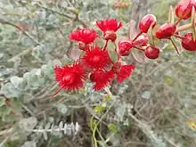 The large size and bright red flowers of this plant distinguish from it from its near relations. These shrubs are erect and may attain a height between 0.7 and 4.0 metres and one, or several, main stems that branch out 0.3 metres to 3.0 metres across. Some specimens may be tall and erect, but is more commonly bushy regrowth from a lignotuber. This is the result of exposure to bushfires and other disturbances, the new stems emerging as reddish. The foliage becomes bluish or grey when matured.