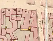 At the time of the 1787 census, No. 239 was home to three households. Hans Brehdahl, a tobacco spinner, resided in the building with his wife M.Marie Westh, their three-year-old daughter, two daughters from his first marriage (aged 15 and 18), and one maid.[2] Mogens Fransen, a beer seller (øltapper), resided in the building with his wife Berte Friderichs.[3] Niels Aagesen, another beer seller, resided in the building with his wife Mette Jørgensen.[4]