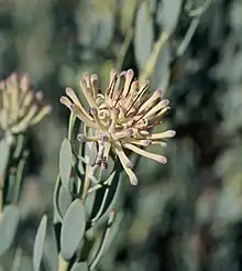The very densely woolly, pointy bracts subtending the individual flower are oval to lance-shaped, about 5 mm (0.20 in) long and 2 mm (0.08 in) wide. The 4-merous perianth is 1⅓–1¾ cm (½–⅔ in) long, straight when still in the bud, pale pink in colour but deep claret near the top. The lower part, that remains merged when the flower is open, called tube, is hairless and 2–2½ mm (0.08–0.10 in) long. The segments in the middle part (or claws), where the perianth is split lengthwise, spread at right angles, are all the same length, shaggy to densely shaggy hairy, and coil back as soon as the flower opens. The segments in the upper part (or limbs), which enclosed the pollen presenter in the bud, are ellipse-shaped, about 2 mm (0.08 in) long, and covered with shaggy to short, dense, matted hairs. From the centre of the perianth emerges a straight, initially pale pink to carmine, later deep claret coloured style of 1¼–1¾ cm (½–⅔ in) long. The thickened part at the tip of the style called pollen presenter is hoof-shaped, about 1½ mm (0.06 in) long, at first brownish, later blackish to deep purple. The downy hairy ovary is ellipsoid to egg-shaped, about 1 mm (0.04 in) long, and clearly distinguished from the style. The ovary is subtended by four yellow, awl-shaped scales of about 1 mm long.[3]