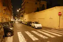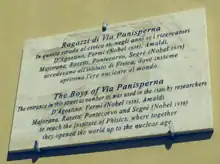 The Via Panisperna in 2021; the plaque hangs to the left of the traffic sign; it refers to an entrance to the building seen side-on; behind the wall lay the Institute's garden