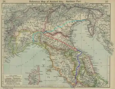 Via Postumia is highlighted in light blue. It is reached from Rome at Placentia via the Via Flaminia (dark blue) followed by the Via Aemilia (red).