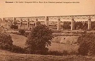The bridge was erected during the German occupation, under the directions of the occupying forces. It was part of the so-called Montzen line designed to provide an alternative relatively unimpeded rail route for the speedy transfer of supplies to the western front across the high ground marking the pre-war border between Germany and Belgium. The existing mainline route, a short distance to the east, via Herbesthal, was becoming increasingly congested through sheer volume of traffic. The old frontier crossing at Herbesthal railway station itself was the channel through which more than 70,000 Belgian forced labourers passed, and it also became the unintended home and nursing centre for thousands of stranded war casualties. Work on the Geul Valley bridge started early in 1915 and was completed in October 1916, although the full "Montzen line" rail route opened for through traffic only in 1917. The companies involved in the construction were, principally, Dyckerhoff & Widmann, MAN Werk Gustavsburg Grün & Bilfinger and Gutehoffnungshütte.[3] Under the wartime conditions of the time, forced labourers from Belgium, Germany, Italy, Hungary, Croatia and Russia were used for the work along with Russian prisoners of war, many of whom were at that time interned in the nearby "Val de Vie" camp.[2]