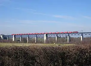 The bridge comprises 22 twin track bridge-deck sections[1] together with two abutments at the ends. The deck sections are supported by five stone support pillars and sixteen tamped concrete pillars, manufactured using a technique that was new at the time of the viaduct's construction.