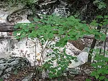 This plant grows in wooded areas with limestone substrates. The overstory includes several types of oak and Carya ovata var. australis.[4]
