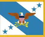 The positional color (flag) of the vice chairman of the Joint Chiefs of Staff is white with a diagonal medium blue strip from upper hoist to lower fly. Centered on the flag is an American bald eagle with wings spread horizontally, in proper colors. The talons grasp three crossed arrows. A shield with blue chief and thirteen red and white stripes is on the eagle's breast. Diagonally, from upper fly to lower hoist are four five-pointed stars, medium blue on the white, two above the eagle, and two below. The fringe is yellow; the cord and tassels are medium blue and white. The design was approved by Secretary of Defense Caspar Weinberger on 20 January 1987.[8]
