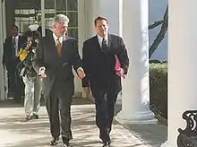 Vice President Gore with President Bill Clinton walking along a colonnade at the White House
