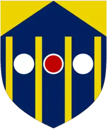 Azure a Roundel Gules fimbriated Argent between two Roundels also Argent and all between four Pallets Or a Chief per chevron throughout also Or and Azure