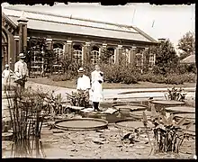 A woman standing on a leaf of Victoria cruziana in the lily pond in front of the Linnaean House of the Missouri Botanical Garden. A wooden plank and a towel is placed on the pad to distribute the weight over the leaf's surface.
