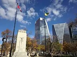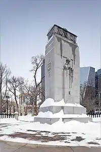 Originally a treeless square that was set aside in 1883, it was renamed after Queen Victoria in 1907. Since that time it has received considerable improvements including many trees, the Regina Cenotaph, and a children's playground.[3] The original centerpiece of the park was the Davin Fountain, named after Nicholas Flood Davin, local Member of Parliament and founder of the Regina Leader-Post newspaper. The fountain was removed in 1926 when the Cenotaph was erected in its place.[1]