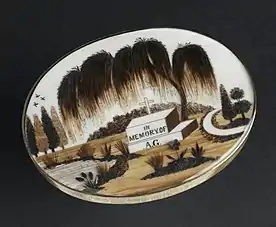 The symbol of eyes had a powerful significance in mourning jewellery.[3] A single eye was often included in jewellery such as brooches.[3] An eye signified a spiritual presence of the departed with the person who wore the jewellery, in this way the departed could watch over the person who was wearing the jewellery. Another element often incorporated into jewellery were pearls which represented tear drops.[3] The fashion of mourning jewellery gradually declined in 1901 following the death of Queen Victoria.[9]