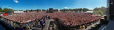 This festival is the largest music festival in France, attracting more than 280,000 festival-goers every year (346 000 in 2023).[1] This festival was created in 1992 in Landeleau, a small village in central Finistère. At that time, less than 500 revellers attended and the festival was more like a private party. The following year, the festival welcomed more than 2000 and that was the beginning of its success story. In 1995, due to lack of space on the original site, the festival moved to Carhaix city center and in 1998, for the same reason, the festival chose a site on the outskirts of Carhaix. In October 2016 the festival organizes an exceptional concert at Central Park in New York City in tribute to the many Bretons who were immigrants to the city in the nineteenth century.