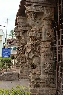 The temple consists of a sanctum (garbhagriha), a vestibule (called sukhanasi) that connects the sanctum to the navaranga (closed hall where devotees gather for prayers) and an open hall (mandapa).[1] The base on which the walls of the navaranga are built (called adhisthana) has the several moldings. The walls that rise from this have slender decorative pilasters. The open mantapa that has several ornate pillars appears to have modified the original north–south entrances that existed in the navaranga (also called mukhamantapa).[1] The entrance to temple has an impressive row of yali pillars that depict warriors riding lions. The temple has numerous independent sculptures including Anantha, Garuda, and Hanuman, the monkey god from the Hindu epic Ramayana.[1]