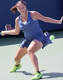 Returning to WTA Tour, she played at the Swiss Open in Gstaad and at the Moscow River Cup. In Gstaad, she defeated Martina Trevisan in the first round, and then lost to Veronika Kudermetova.[24] In Moscow, she lost in the first round of the main draw to Görges.[25] She then went to the US Open Series, first at the Cincinnati Open, where she played her first Premier Mandatory/Premier 5 qualifying and beat Caroline Dolehide and Camila Giorgi, securing her place in the main draw.[15] There she marked her first Premier 5 win, defeating another qualifier, Sasnovich, in three sets. In the second round, she lost to Kristina Mladenovic.[26] At the US Open, she lost to Azarenka in the first round of the main draw.[27] In September, Kužmová went to China to play at the Guangzhou Open, where she defeated Ivana Jorović in the first round but lost in the next round to Bernarda Pera. Her next step was the Premier 5 Wuhan Open, where she lost in the first round of qualifying to Wang Xiyu.[15] Back in Europe, she lost in the first rounds of the Linz Open and the Luxembourg Open.[28][29] On 17 December 2018, after winning the $100k Dubai Challenge, Kužmová debuted in the top 50. She finished the year as No. 56.[16]