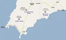 Aldeia do Bispo situated initially farther east of the current settlement, from the writings of Father Luís Cardoso, in the 18th century. The author mentioned that the parochial church existed outside the settlement, and the Aldeia de Santa Maria do Cabo (today extinct) was situated in the Curraes da Granja.[8] Bishop Fernando Coutinho (master of Aldeia do Bispo) received the donation from King Manuel, of the Aldeia de Santa Maria do Cabo and integrated ito into the perimeter of Aldeia do Bispo.[9] It was probably the privateer Francis Drake who was, later, responsible for the destruction of Aldeia de Santa Maria do Cabo.[10]