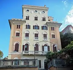 In the 19th century, the property of the aristocratic Acquarone family, the villa was enriched and elevated with the addition of a fourth story, and was then known as "Villa Acquarone" or "Palazzo Acquarone",[6] still surrounded by a large park, part of which was landscaped and part used for dairy farming. The milk produced was sold in the historical "vaccheria" (dairy shop) located near the uphill station of the Sant'Anna funicular in via Agostino Bertani, an important contribution to the life of the neighborhood as the area surrounding Genoa was not suitable for dairy farming and milk had to be imported.[7]