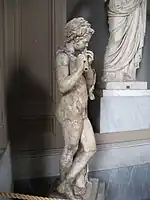 The first recorded excavations were by Cardinal Collicola between 1720 and 1728 under pope Innocent XIII (1721-1724).[5] The policy of the Barberini family was to build at the expense of ancient monuments by robbing their building material to build the docks of the canal and other buildings. An army of convicts was used to knock down walls and prepare building material, while porters transported them to the work site at lake Paola. Even marble was removed from floors. This systematic destruction took place not only in the Villa of Domitian, but also in the area of the port-canal of Circeii, on the Via Severiana, where almost all the tombs were razed to the ground, and in the villas around the present Casarini ruins. The most valuable objects, meanwhile, were sold to the noble villas of Rome and to the Vatican. They then ended up on the antiques market of the time and marbles and statues were divided into many museums, among which was the important statue of the so-called Apollo Kassel[6] (now in a Kassel museum) after passing through the Conti collection and bought in 1777 by Landgraf Friedrich II. Another mission by the Papal States in 1798 undertaken by Petrini had the aim of looting works of art for profit and led to the discovery of about 29 statues including the Vatican Faun.