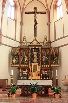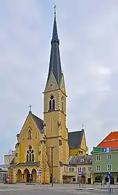 In 1886, because of a great shortage of priests, Mgr. Peter Funder, bishop of Gurk, asked the Tyrolean Franciscan Province to take on the spiritual care of the parish of Sankt Nikolai in Villach.[1] In the same year the first Franciscans arrived in the town and moved into the Capuchin friary, suppressed in 1786. Both the friary and the next-door church were so desolate, however, that both had to be demolished in the following year and rebuilt. Most of the cost was borne by Stephan Dionys Cserveny von Zabor from Salzburg. Thus, despite massive resistance from the municipal authorities, the friary was newly established in 1888 and the removal of the old church began in 1890/91.[1] The church and the high altar were built to plans by the Franciscan Fr. Johannes Maria Reiter and were formally consecrated in 1896.[2]