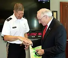Dooley was inducted as a Georgia Trustee in 2011. Conferred by the Georgia Historical Society, in conjunction with the Governor of Georgia, to individuals whose accomplishments and community service reflect the ideals of the founding body of Trustees, which governed the Georgia colony from 1732 to 1752.[37] He was inducted into the Marine Corps Sports Hall of Fame in July 2012.[38] Six years later, the Georgia Historical Society established the Vincent J. Dooley Distinguished Fellows Program in honor of Dooley. It was designed to accomplish two goals consistent with Dooley's life and legacy – recognizing senior scholars in the field of history and mentoring and developing emerging historians.[39][40] Historian David Blight and author Rick Atkinson have been named Vincent J. Dooley Distinguished Teaching Fellows.[41]
