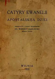 In 1925 and 1926 Hadleŭski was arrested and questioned twice for organizing anti-Polish rallies. He was arrested for the third time and convicted of anti-Polish agitation in 1927. Allegedly, the evidence against Hadleŭski was falsified by his opponents.[1] His active promotion of Belarusian language and independence earned him a two-year jail sentence. While in prison, he wrote a book about the history of the New Testament for Belarusian schools (the book was published in Wilno in 1930). After his release he lived in Wilno, where he translated the New Testament into Belarusian.[1]