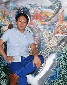 ![]() Vincent de Pio with his painting, "Shark's Fin" | |