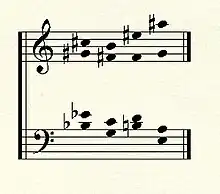For example, Messiaen has written that "The 'Theme of Chords' is heard throughout, fragmented, concentrated, surrounded with resonances, combined with itself, modified in both rhythm and register, transformed, transmuted in all sorts of ways: it is a complex of sounds intended for perpetual variation, pre-existing in the abstract like a series, but quite concrete and quite easily recognizable through its colours: a steely grey-blue shot through with red and bright orange, a mauve violet spotted with leather-brown and encircled by bluish-purple."[3]
