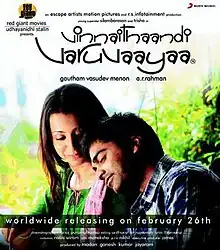 Vinnaithaandi Varuvaayaa (transl. Will you cross the skies for me?) is a 2010 Indian Tamil-language romantic drama film written and directed by Gautham Vasudev Menon, starring Silambarasan and Trisha. Jointly produced by Elred Kumar, Jayaraman, VTV Ganesh and P. Madan under the banner Escape Artists Motion Pictures and RS Infotainment, the film was distributed by Udhayanidhi Stalin's Red Giant Movies. The story was simultaneously shot in Telugu as Ye Maaya Chesave, starring Naga Chaitanya and Samantha, however, with a different cast.[1]