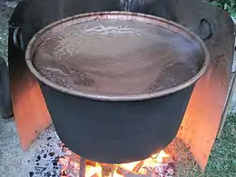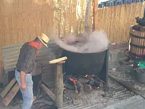 The raw material comes from any of the red and white grapes of the region, particularly damaged bunches, and may include the pomace left over from normal winemaking. Thus it is a way to ensure that none of the harvest is wasted. This material is crushed and cooked in a large cauldron over a fire for 24 hours, which gives its characteristic aromas. Traditionally two men attended it, taking turns to sleep and constantly stirring and skimming off the scum that formed on the surface. The must is cooked until a half or a third of the volume remains, depending on how sweet it is to be. In the Marche some add a quince for every quintal of must to flavor the drink. Once cooled, the must is transferred to oak or chestnut casks where it is left to ferment. It is racked off the lees once or twice.