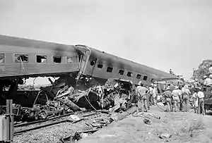Shortly before 7 a.m., the trains collided head-on at a closing speed later estimated at 172 km/h (107 mph).[10] According to Brendecke (who survived his fall from the cab and the subsequent crash), as well as motorists on the adjacent Hume Highway, the force of the collision propelled the locomotive of the Southern Aurora, and several of the goods wagons, into the air.[9] Six of the passenger carriages were derailed, and one was completely crushed by other wreckage.[11] The two leading carriages telescoped into the rear of the locomotive, and two others rode over the top of the wreckage, suspending them some 30 ft (9 m) in the air.[12]