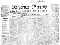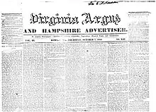 ![]() Front page above the fold of an issue of the Virginia Argus and Hampshire Advertiser published on October 7, 1852. | |