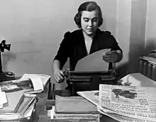 Virginia Irwin (1908–1980) was an American Second World War war correspondent who worked for Joseph Pulitzer.[1] A photo of her with the headline "She Got to Berlin" featured in the St. Louis Post-Dispatch on VE Day, 1945.