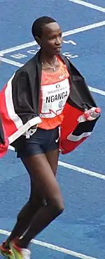 Virginia Nyambura Nganga (born 20 July 1993) is a Kenyan runner who specialises in the steeplechase. She was the gold medallist in the steeplechase at the 2010 Summer Youth Olympics and won her first senior medal at the 2015 IAAF World Relays, where she was a member of the Kenyan team which broke the African record for the distance medley relay. Her personal best for the 3,000 metres steeplechase is 9:13.85 minutes, set in 2015.