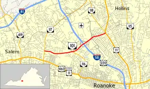 SR 101 begins at an intersection with SR 117 (Peters Creek Road) in the northwestern part of the city of Roanoke. The state highway heads east as a two-lane undivided road between the Westview Terrace and Washington Heights neighborhoods. SR 101 expands to a six-lane divided highway just west of its intersection with Cove Road, which heads south as SR 116. The state highway curves northeast through a commercial area where it has a cloverleaf interchange with I-581 and US 220. SR 101 passes along the southern edge of the Roanoke Regional Airport property and has a partial cloverleaf interchange with the intersecting boulevard, which heads south as Valley View Boulevard toward the Valley View Mall and north as Aviation Drive to provide access to the airport. The interchange includes a flyover ramp from eastbound SR 101 to northbound Aviation Drive. The state highway continues east through another commercial area to its eastern terminus at US 11 (Williamson Road). Hershberger Road continues east as a two-lane undivided city street to the eastern city limits of Roanoke, where it continues into Roanoke County as SR 625 to SR 115 (Plantation Road).[1][2]
