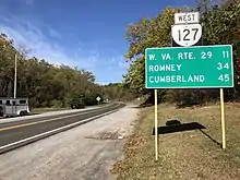State Route 127 (SR 127) is a primary state highway in the U.S. state of Virginia. The state highway begins at the West Virginia state line at Good, West Virginia, where the highway continues west as West Virginia Route 127 (WV 127). SR 127 heads east 3.55 miles (5.71 km) to U.S. Route 522 (US 522) near Cross Junction in northwestern Frederick County. SR 127 is the easternmost portion of Bloomery Pike, a turnpike that connected Winchester with the namesake iron smelting center.