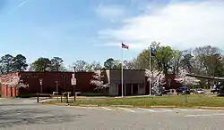 The building has undergone three phases of construction. The original structure is visible as older brickwork, and was essentially a long, narrow building whose construction began in 1941 using $15,000 of State funds and $15,000 of city funds.[6][2] By 1954, the shape of the museum had evolved from a line into a "T" with the completion of an addition (now the Early Wars, Poster, and African American gallery areas).[6] The final addition was completed in 1987, in which the left side of the "T" was enclosed to form the Fowler and Weapons Galleries along with the current Education areas and restrooms.