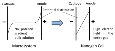 For electrochemical reactions with high-concentration electrolyte in the macrosystem, the Debye-length is quite small. Due to the screening effect almost all of the potential drop is confined within the small Debye-length region (or double layer region). The potential in bulk solution (far from the electrodes) does not change too much, meaning that there is nearly zero electric field inside the bulk solution. However, when the counter electrode is within the Debye-length region (i.e., nanogap electrochemical cells), two double layers from anode and cathode overlap with each other. The electrostatic potential inside the entire gap changes dramatically, meaning that the huge electric field is uniformly distributed across the entire gap.