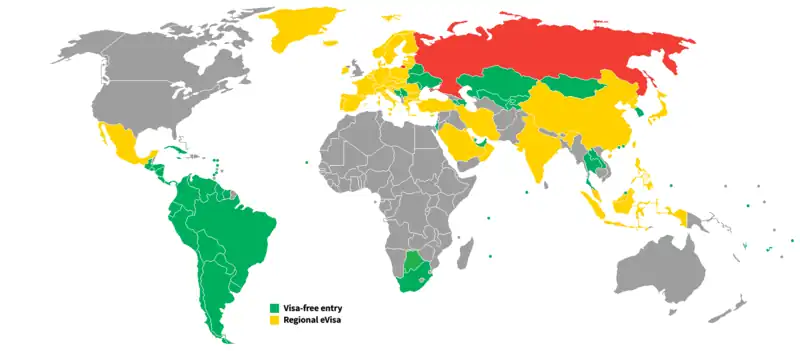 In April 2014, Crimea's tourism minister proposed a visa-free regime for foreign tourists staying at Crimean resorts, for up to 12 days, and a 72-hour visa-free stay for cruise passengers. Visa-free access for Chinese citizens was proposed in June 2014.[18] Visa-free entrance to Sevastopol began from September 2015.[19] Other parts of the proposals have been not realized.