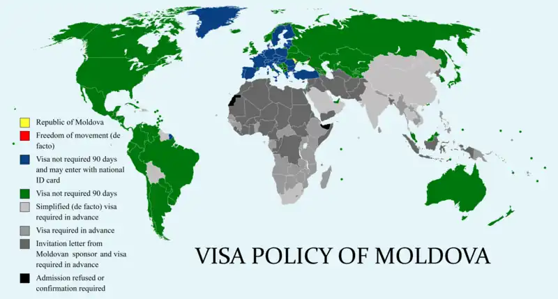 Citizens of visa-required countries are allowed to visit Moldova without a Moldovan visa if they hold a valid residence permit, a valid 'C'-type, or a valid 'D'-type visa issued by a Schengen member state or a European Union member state.[26]