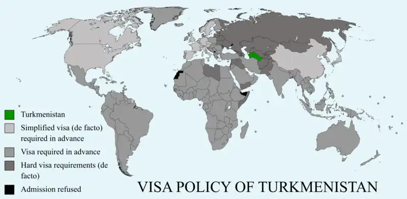 In accordance with the law, citizens of all countries require a visa to visit Turkmenistan, unless they have special passports. From 2003–2013, people from certain parts of Kazakhstan or Uzbekistan also enjoyed visa exemptions.[1] To obtain a tourist visa for Turkmenistan, all foreign nationals must supply an invitation letter issued by a travel agency licensed in Turkmenistan.[2]